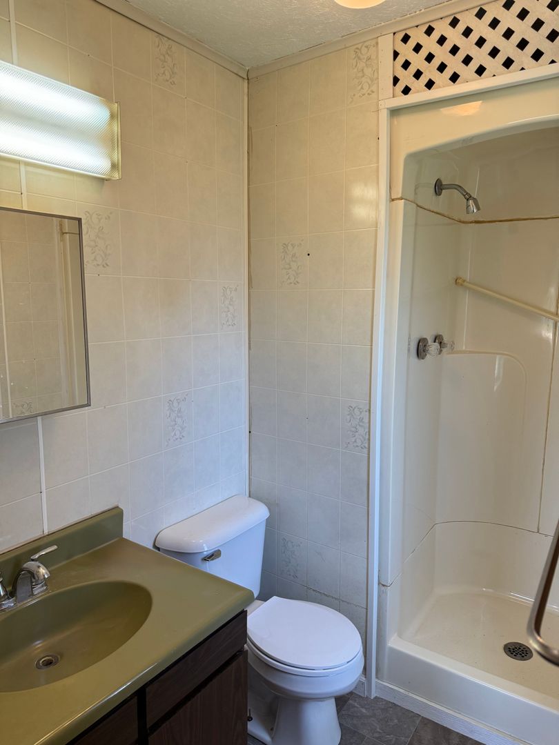 with shower, kitchen area with a lot of cabinet / countertop space, A/C.